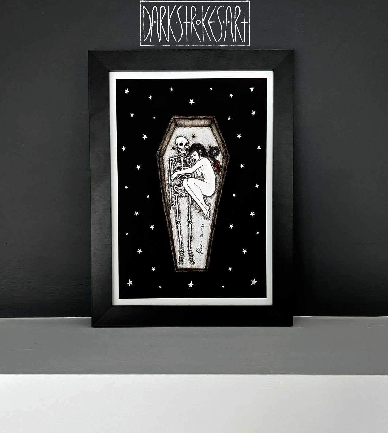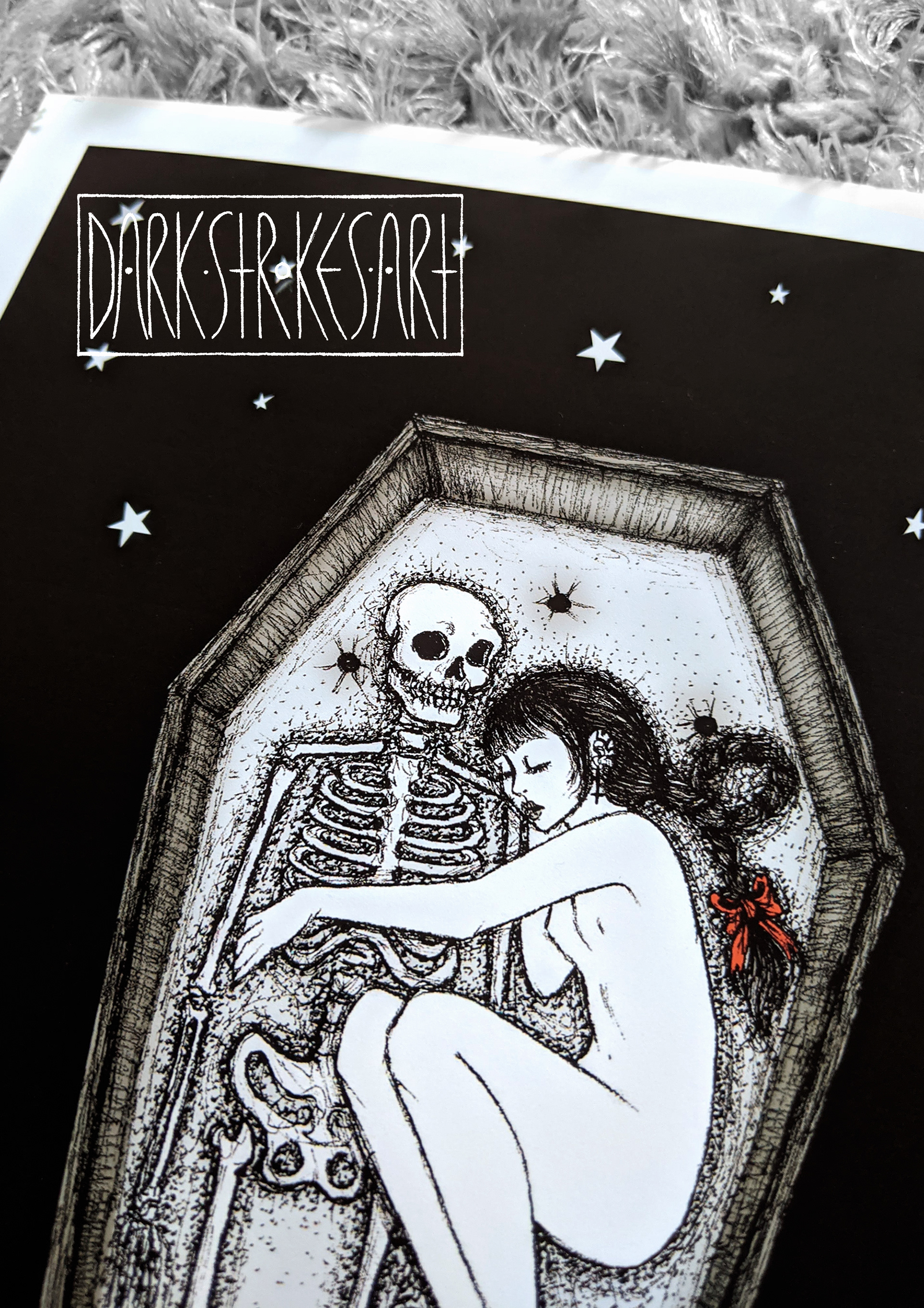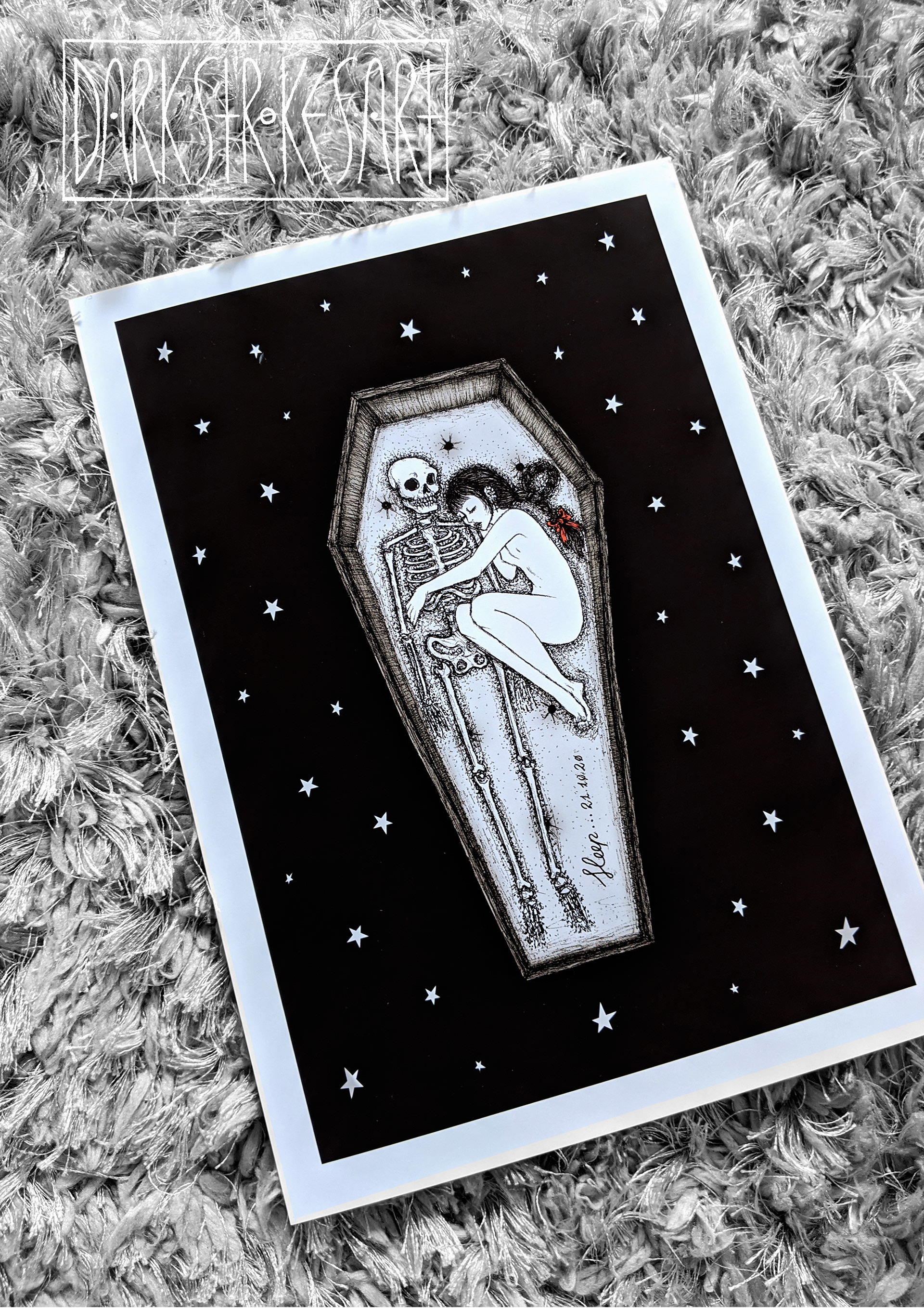 Original art print illustration inspired by insomnia and my interpretation of sleep as a small death. High-quality prints are available on Etsy.