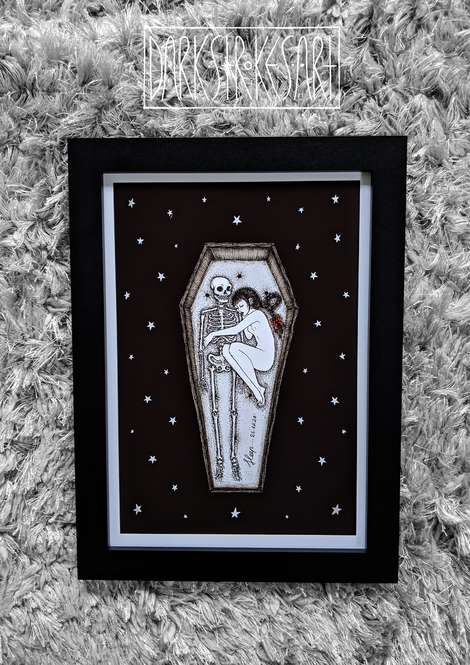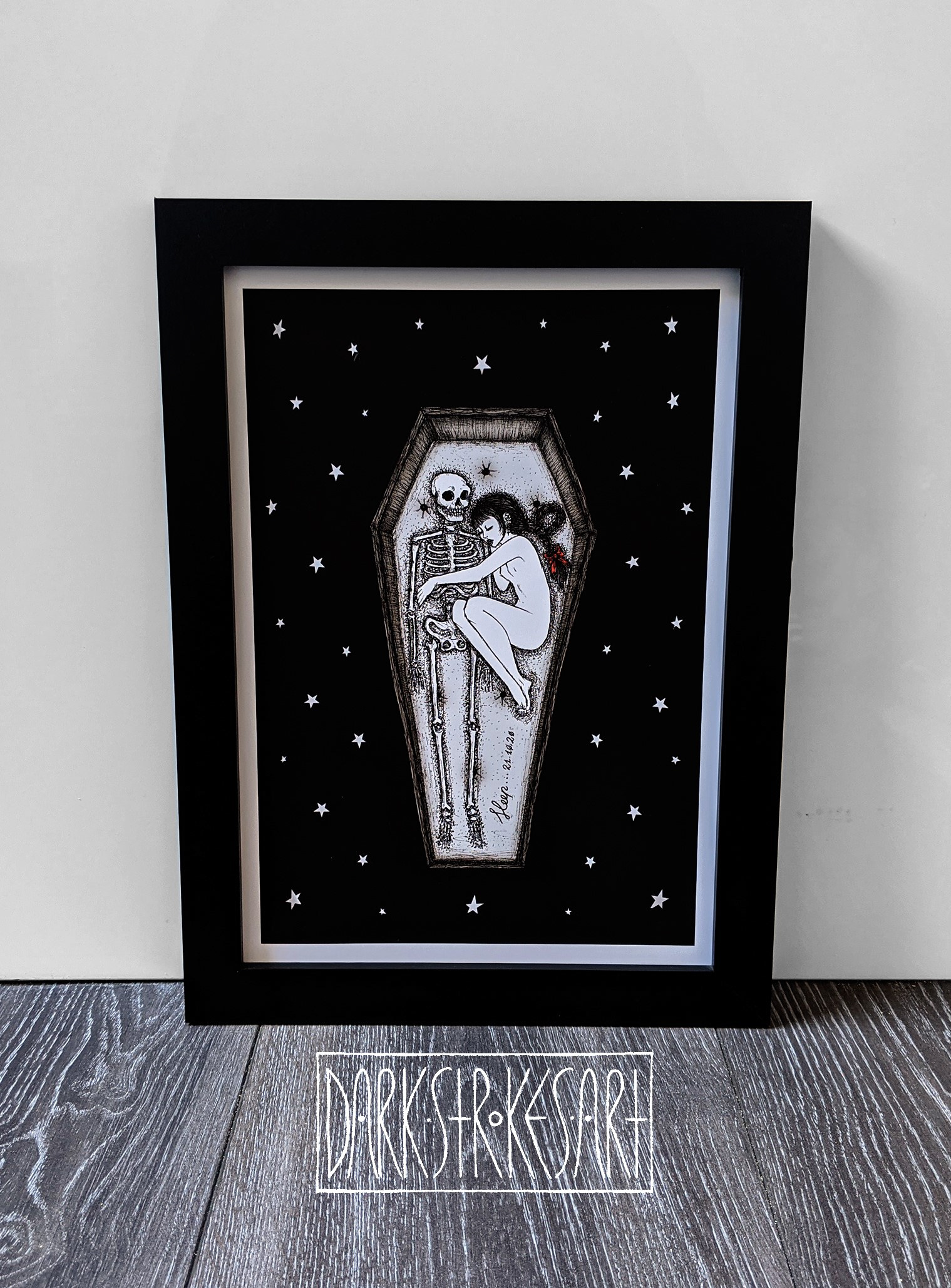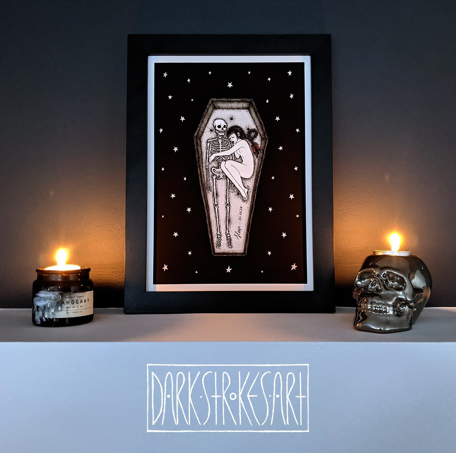 Original art print illustration inspired by insomnia and my interpretation of sleep as a small death. High-quality prints are available on Etsy.